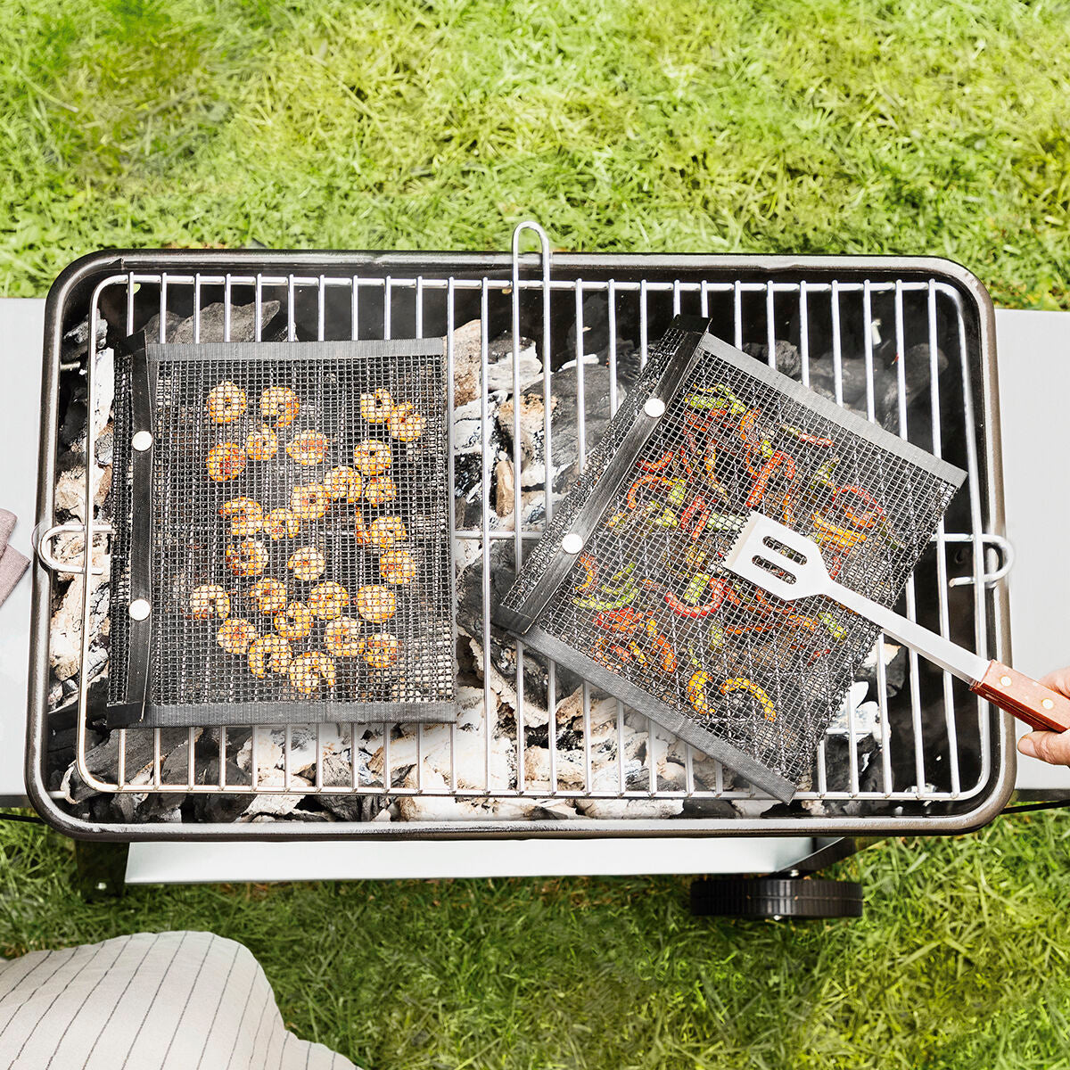 Un set de 2 bolsas de malla para barbacoa perfectas para asar verduras y otros alimentos pequeños sin que se peguen ni se caigan y se quemen. Son muy prácticas y fáciles de usar, sólo hay que introducir los alimentos en las bolsas y colocarlas sobre la parrilla de la barbacoa (nunca directamente sobre las llamas). Los alimentos se cocinan mejor y con más sabor, ya que el humo pasa a través de la malla. Simplemente, hay que dar la vuelta a las bolsas para cocinarlos por el otro lado. Al estar dentro de las bolsas, los alimentos no se esparcen ni se caen mientras se cocinan, y una vez cocinados, se extraen fácilmente gracias al material antiadherente. Además, las bolsas se limpian con facilidad en el lavavajillas. Un método más higiénico y eficaz para cocinar los alimentos en la barbacoa.
