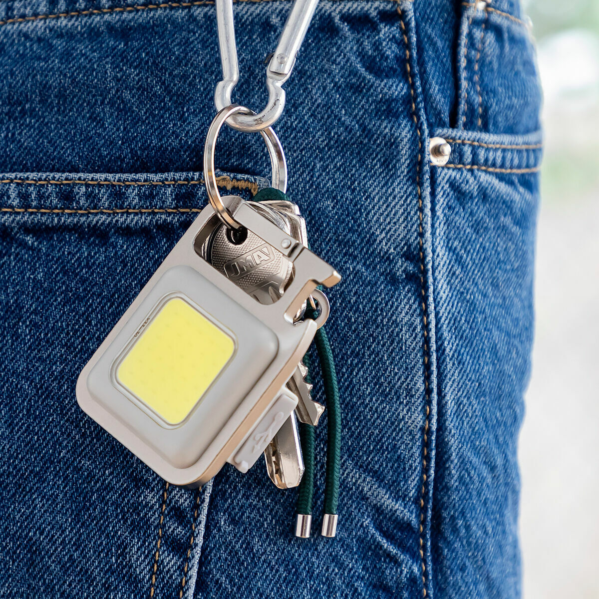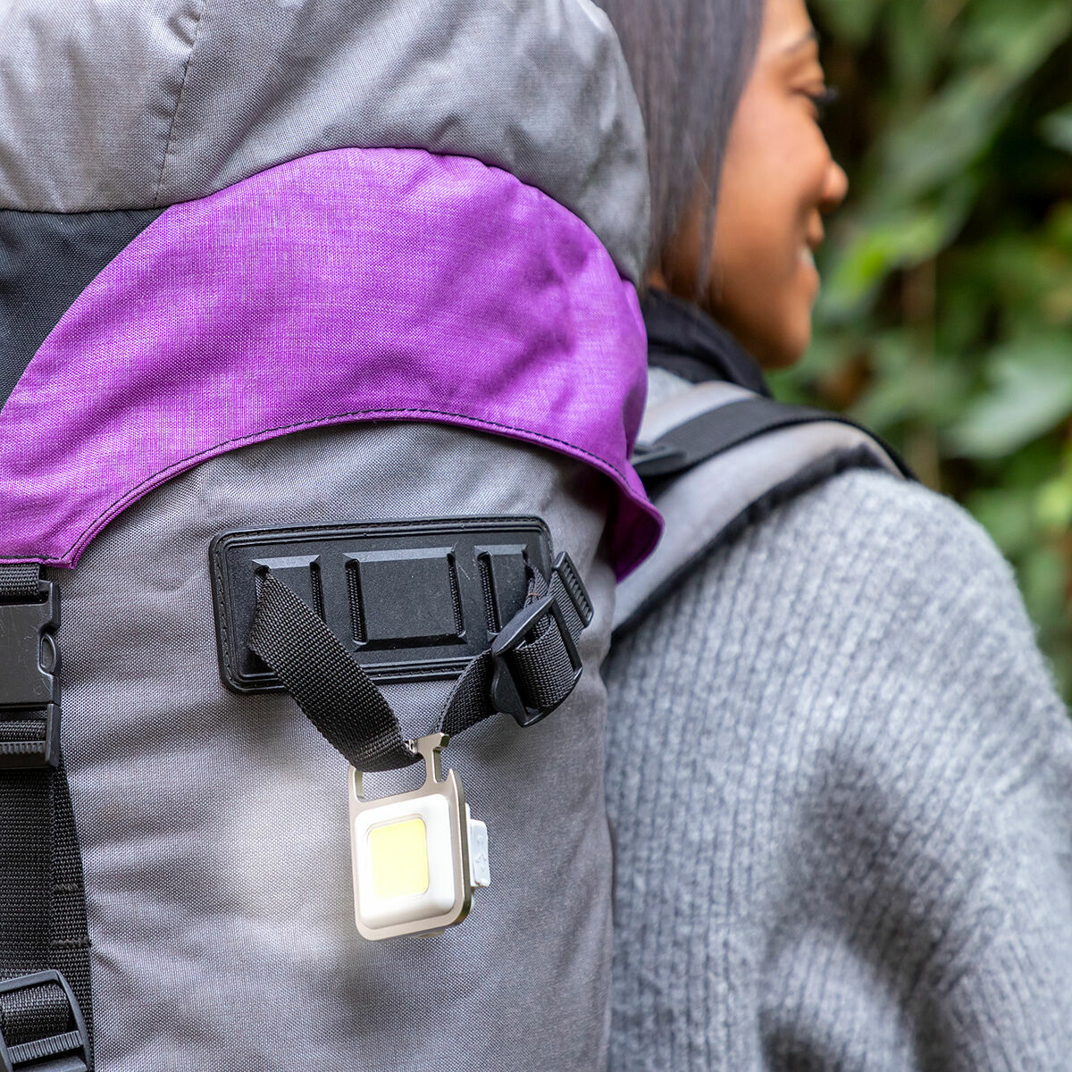 - Mosquetón para colgar como llavero: esta mini luz LED recargable tiene en la parte superior un orificio de enganche que se abre y se cierra para poder colgarla a modo de llavero en mochilas, pantalones, bolsos, etc. Así, siempre estará a mano para usarla cuando se necesite.