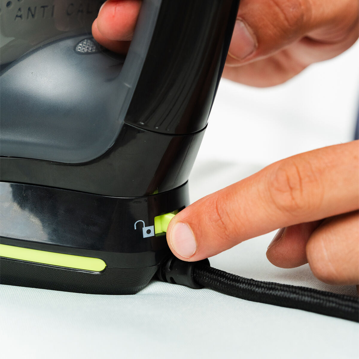 - Base de carga independiente, calentamiento rápido: esta plancha de vapor inalámbrica se calienta en pocos segundos. Dispone de una base extraíble que sirve como soporte de calentamiento cuando la plancha se utiliza por separado (sin cable). La base tiene un seguro de bloqueo para unirla a la plancha y utilizarla con cable abatible que facilita el planchado (2 m aprox.). Potencia: 2400 W. Enchufe F.