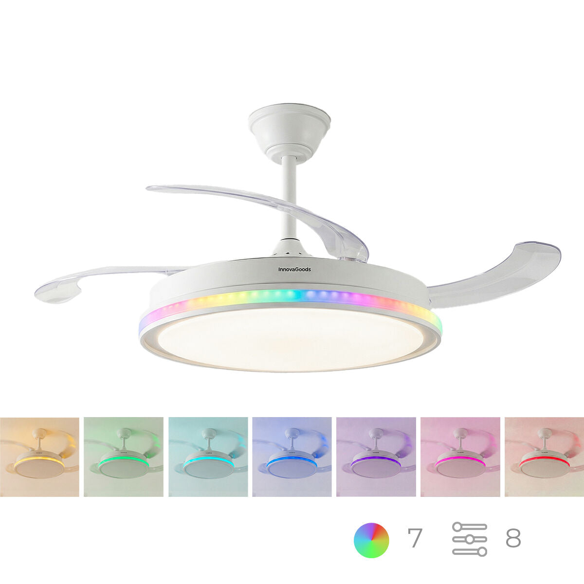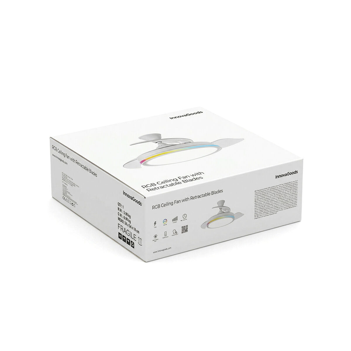 This ceiling fan with RGB LED light and retractable blades combines comfort, style, power and efficiency, creating a personalised feel-good atmosphere. With a central LED light with 3 colour temperatures and dimmable brightness, plus an RGB ring with 7 colours and 8 dynamic sequences. Quiet, 6 speeds, timer, summer/winter function, DC motor and remote control for easy operation. Ideal for rooms up to 25 m².