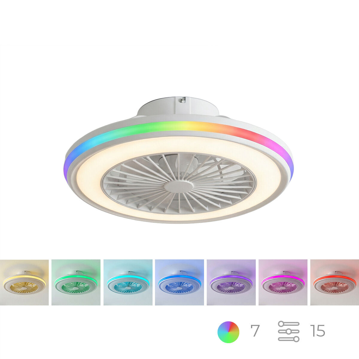 • RGB LED RING, 15 MODES, CUSTOMISED AMBIENCE: Creates a very special atmosphere in the living room or bedroom, turning the ceiling into a vibrant decorative feature with 15 fixed and sequential multicolour lighting modes.