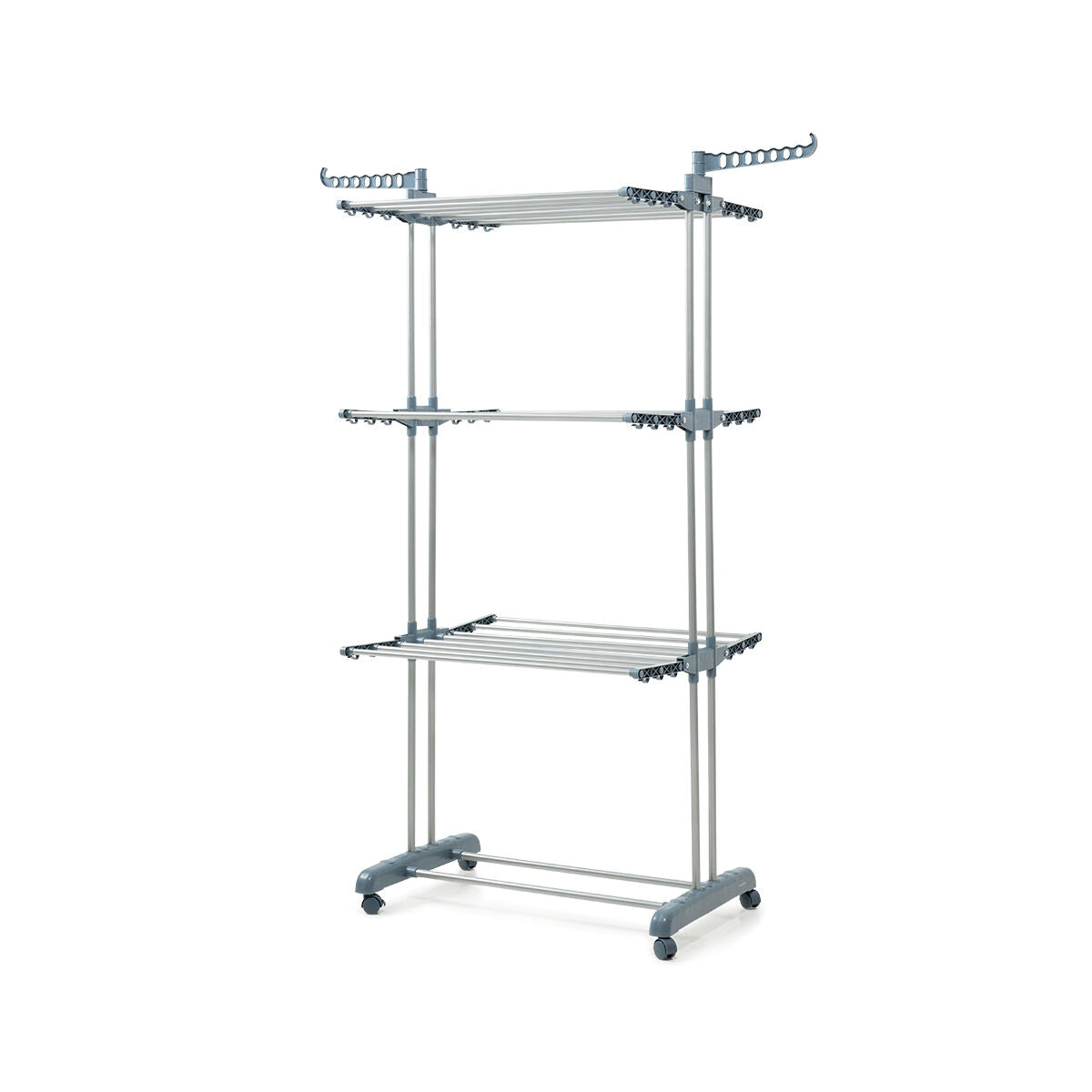 - Large capacity, 3 height levels, 24 bars: this vertical clothes airer has 24 metal bars distributed over 3 levels which equates to 17 m of washing line for all types of clothing. Thanks to its large capacity and hanging surface, it holds up to 40 kg of clothing.