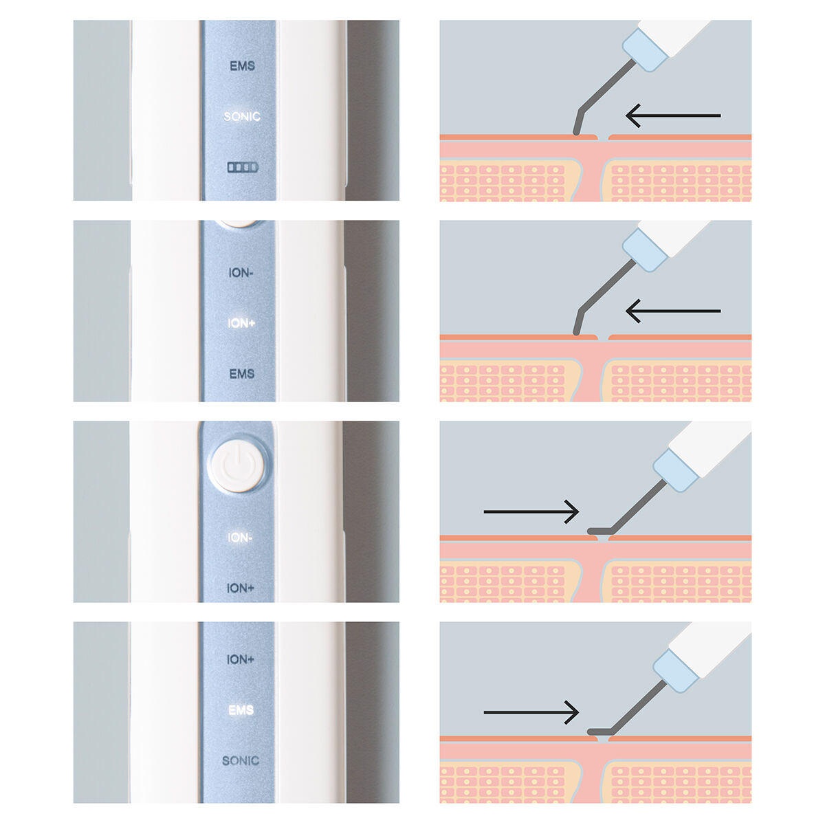 - 4 modi met ledindicator: volgorde van toepassing: 1º SONIC: reinigt diep door vibratie. 2º ION+: verwijdert mee-eters en vuil (+ionen trekken onzuiverheden en toxines aan). 3º ION-: verbetert de hydratatie en stimuleert de opname van cosmetica, waardoor hun eigenschappen worden versterkt. 4º EMS: masseert, verzacht de huid en bevordert de werking van cosmetica. 1e en 2e aanbrengen met reinigers/tonics en 3e met crèmes. Gebruik niet meer dan 2 min. per functie en niet meer dan 2 min. op hetzelfde gebied.