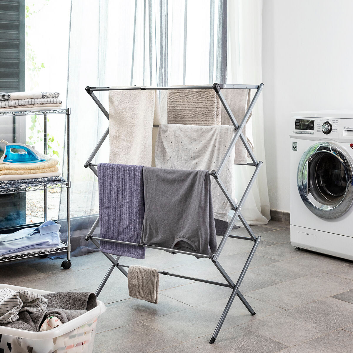 Rozkładana i Rozsuwana Suszarka na Pranie z 3 poziomami wysokości, która pozwala skutecznie zoptymalizować przestrzeń, zajmując niewiele miejsca zarówno podczas jej użytkowania przy powieszonych ubraniach, jak i podczas jej przechowywania. Rozsuwalna konstrukcja suszarki pozwala na dopasowanie jej do ilości wieszanych ubrań, a funkcja składania pozwala na wygodne jej przechowywanie, zajmując minimalną przestrzeń. Ta oryginalna metalowa suszarka na pranie ma dużą pojemność i posiada 11 prętów suszących, ma niewielkie rozmiary, a przy tym jest lekka i wodoodporna. Do produktu dołączono instrukcję użytkowania z ilustracjami; montaż jest prosty i nie wymaga użycia narzędzi.
