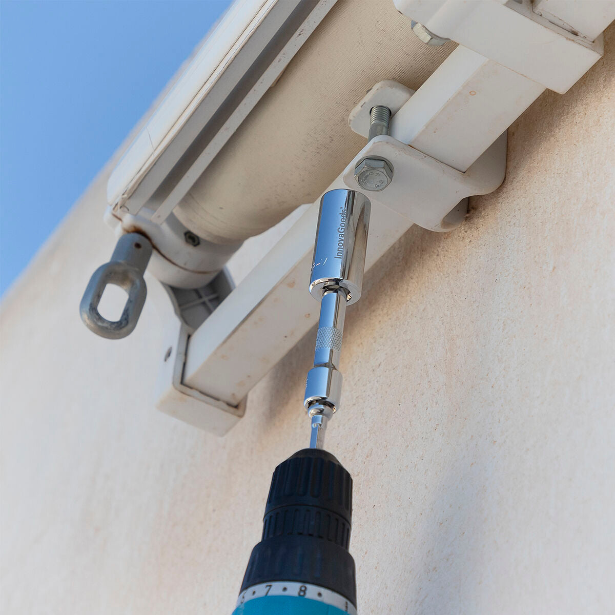 Inovativen in vsestranski univerzalni nasadni ključ z dodatki, ki vam omogoča enostavno privijanje in odvijanje katere koli vrste matic, vijakov, kavljev, konic itd. Prilagodi se poljubni velikosti in obliki znotraj svojih dimenzij - primeren za vijake med 7-19 mm. Zahvaljujoč priloženemu univerzalnemu priključku ga je mogoče enostavno vstaviti v kateri koli ključ, električni ali ročni vrtalnik ali gonilnik z zamenljivimi nastavki. Vključuje dodatek za podaljšanje dosega in kolenčast nastavek z naklonom 105° za težko dostopna mesta ali mesta. kjer je malo prostora. Poleg tega je izdelan iz visoko kakovostnih in odpornih kovin ter je zelo enostaven za uporabo, transport in shranjevanje. S tem izvirnim in praktičnim, kompaktnim ter lahkim orodjem pozabite na prenašanje težkih kovčkov ali škatel z množico nasadnih ključev za različne velikosti in vrste vijakov.