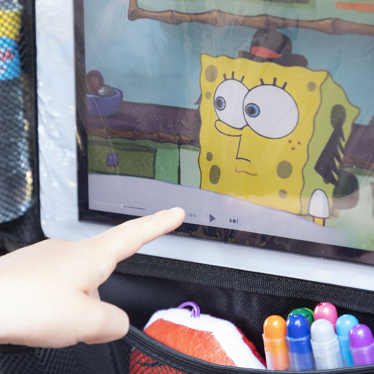 Prozoren in otipljiv žep je kot nalašč za držanje in uporabo tablice, odličen način za organizirano zabavo otrok med potovanjem.